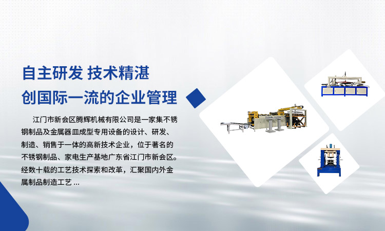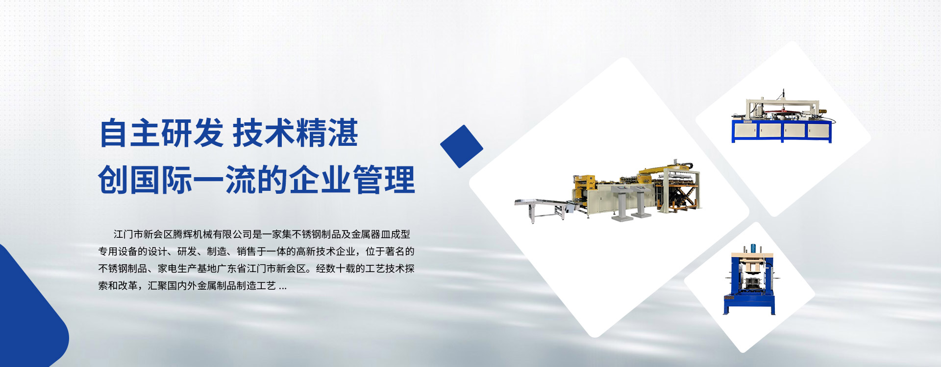 江門市新會區(qū)騰輝機械有限公司是一家集不銹鋼制品及金屬器皿成型專用設備的設計、研發(fā)、制造、銷售于一體的高新技術(shù)企業(yè),位于著名的不銹鋼制品、家電生產(chǎn)基地廣東省江門市新會區(qū)。經(jīng)數(shù)十載的工藝技術(shù)探索和改革,匯聚國內(nèi)外金屬制品制造工藝。